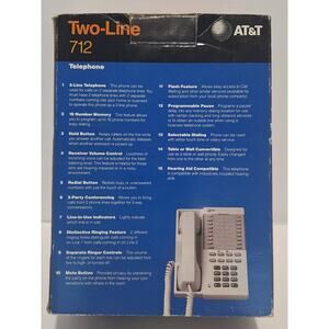 Vintage AT&T Two-Line 712 telephone, new old stock. Box opened only to confirm contents; handset, cords, and phone are still factory-wrapped. Includes original owner’s manual and all packaging inserts. Box shows normal shelf wear from age, but the phone itself is unused and in excellent condition.