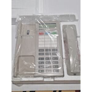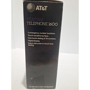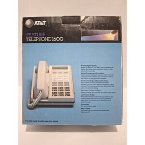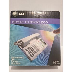 Vintage AT&T Feature Telephone 1600 in mint new old stock condition. Still packed in original AT&T foam with bagged handset, cords, and inserts. This 1980s/early-90s digital memory phone features a clear LCD display for time/date, one-touch dialing for 16 numbers, 3 emergency call locations, selectable tone/pulse dialing, ring control, and touch-sensitive keys. Color is Smokey Pearl, a harder-to-find finish.