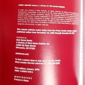 Attack of the Bacon Robots Softcover Book (Penny Arcade, Vol. 1); complete Penny Arcade from the very first strips published online in 1998 through the year 2000 with creator commentary and special sketchbook section.
