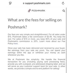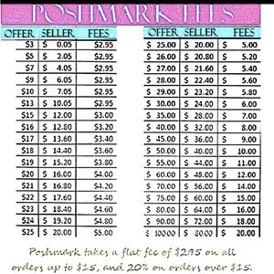 PLEASE NOTE - Poshmark takes a flat fee of $2.95 for all orders up to $15.00. For sales of $15.00 or more Poshmark takes a 20% fee. See the attached Poshmark Seller Fee Chart.