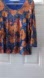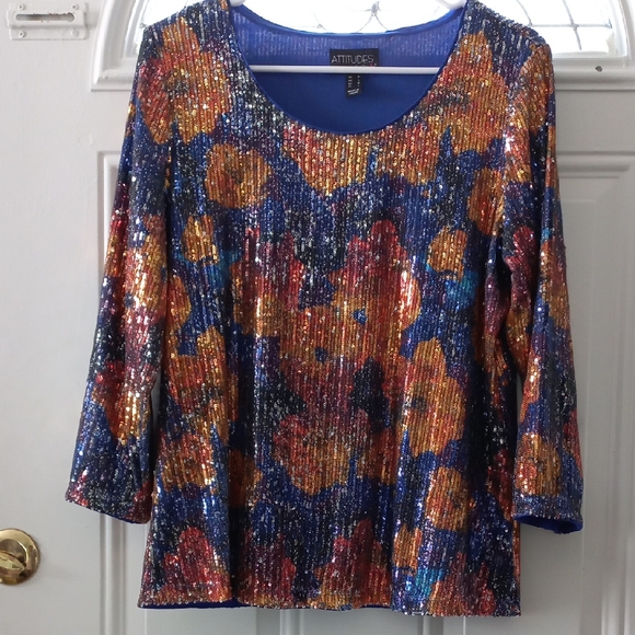 Shimmering sequin top with a scoop neckline. Vibrant blue base with gold and red floral sequin accents. Stretch lining for comfortable wear and a polished evening look.