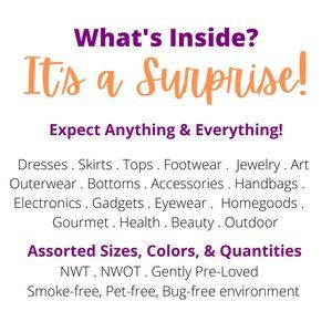 Tops, bottoms, outerwear, tees, socks, jackets, dresses, skirts, sneakers, slides, jeans, pants, shorts, hoodies, bags, wallets, makeup, technology, jewelry, gadgets - what could it be? Everything is fair game and anything shippable is a possibility!