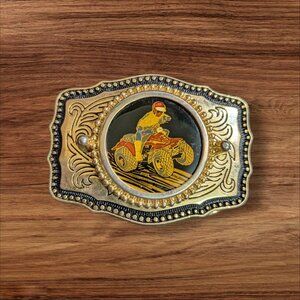 This buckle's got horsepower! Featuring a dynamic ATV rider in gold, it brings vintage flair with a side of rugged charm. Buckle up for adventure!