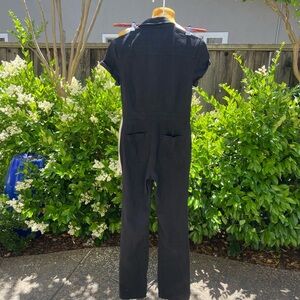 ATWYLD Pit Crew Black Jumpsuit. Features pockets on front, back, and chest panel, collar, rolled sleeves, and button up fascinators on top. 97% cotton 3% elastane