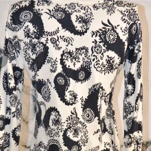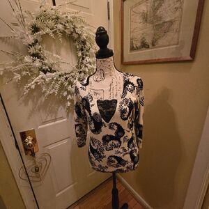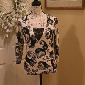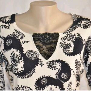 AUGUST SILK KNITS Beige Black Paisley Knit Top Large Beaded Lace Insert