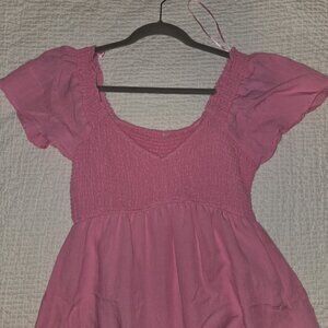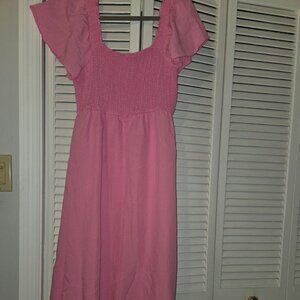 The round neckline, paired with short flutter sleeves, radiates grace. A smocked bodice and empire waist create a flattering silhouette, while the lined flowy midi skirt showcases an elevated hemline.
