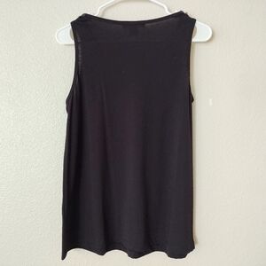 Very sophisticated looking black sleeveless blouse with tan detail work around the neckline. This shirt is darling on its own or worn under a blazer.