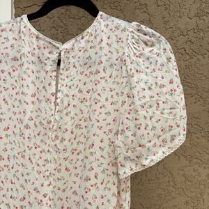 Charming white dress with pink floral pattern. Features short sleeves and a flowing design.