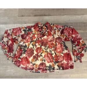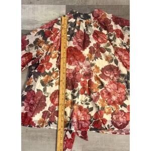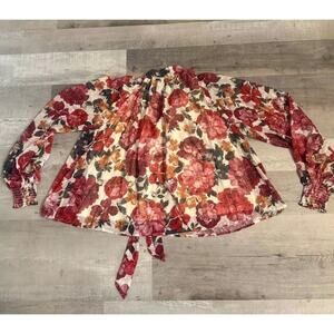 AURA Blouse Top Women Medium Multi Floral Pleated Mock Neck Tie Back Long Sleeve