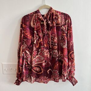 AURA Red Paisley Blouse Tie Neck Flowy Balloon Sleeves Top Large Women’s NWT