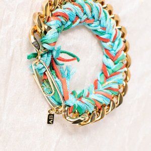 The perfect complement to the bright look is the bracelet by Aurelie Bidermann. Gold and luscious weave from blue to red.