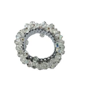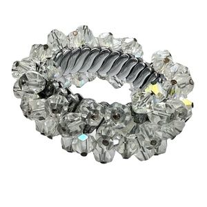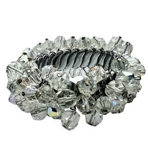 Aurora Borealis faceted clear crystals cha cha bracelet. Set in stretchy silver tone. Clear crystals reflect many different colors. The rows are set on a diagonal and there are 3 8mm crystal beads per row. There are a few crystals missing - but it's almost impossible to tell when worn. Across the inside of the bracelet is 2". It stretches to 4". In very good preowned condition.