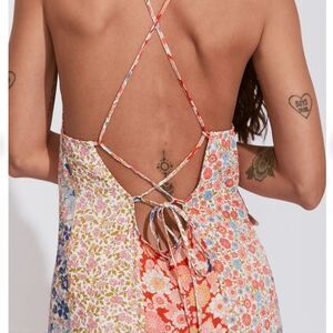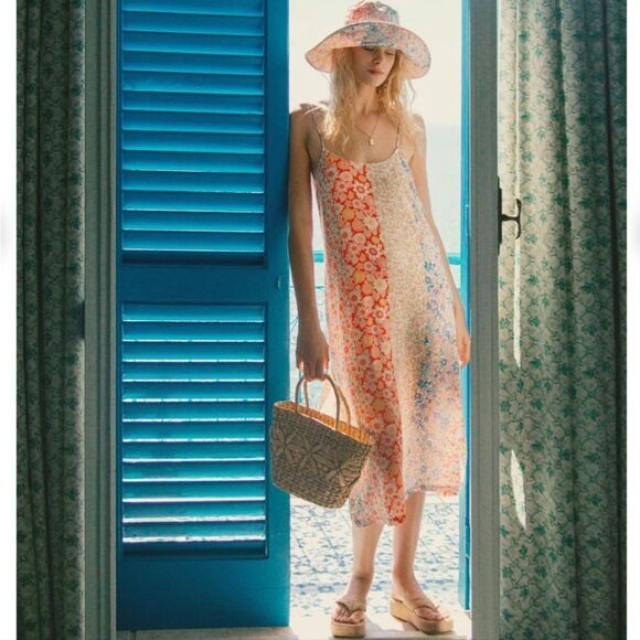 All feminine at the front with exciting splits down the side creating a beautiful silhouette that is sure to turn heads with its striking statement cross back detailing. Pair with strappy heels or summer sandals for an effortless but elevated everyday look. The fabric feels lightweight and breathable, perfect for those summer days. The print features jacquard with herringbone pattern throughout.