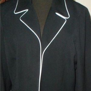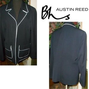 AUSTIN REED Lined Black/White Seasonal Wool Blazer Sz 14. Excellent condition, but does have a name written on label. Open front, two patch pockets with flaps. White braid trim.