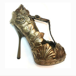 Authentic Couture Glamorous Alexander McQueen Very rare -Stand out edgy heels in bronze leather. Their edgy design features gold studs and strap. These shoes are topped off with a sexy open toe, adorned with gold die cut out hand painted flower. Pair them with any little black to look that is bound to wow! Size 5 - IT 35. Leather upper, lining & sole, Gold stud embellishments. Platform sole1,5", heel 51/4".No box. Excellent condition- twice. The detail on this pumps is exquisite. Made in Italy