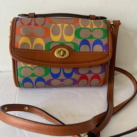 AUTH COACH KIP TURNLOCK CROSSBODY RAINBOW SIGNATURE CANVAS BAG