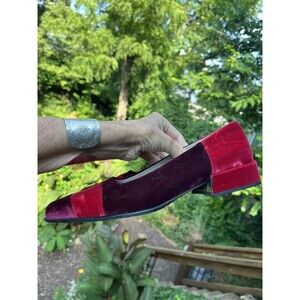 Stunning vintage genuine Prada slip on lush mohair velvet low heel pumps in bordeaux and cherry red. Classic style, pointy toe, velvet stripe that could be dressed up or down. Amazing either way evening wear but pretty cute with jeans too. These shoes are darling! Lined in soft gray leather, block heel covered in velvet just under 1. Very nice condition- light wear on soles. Sz 37 EU, 7 US
