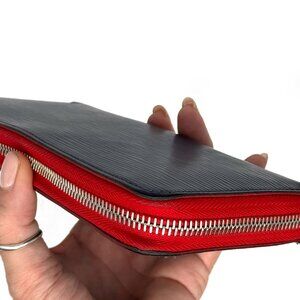 Gorgeous, excellent preloved condition two-toned navy and red (or indigo and rouge in LV-speak) long zippy wallet in epi leather from Louis Vuitton. This wallet is an absolute STUNNER. That pop of red just makes this stand out in a sea of otherwise boring dark wallets. Silver hardware; taiga leather interior; the zippers are zippy. There is some minor rubbing and scratches/ dents on the exterior and one spot of rubbing on the edge of one of the gusset pockets as shown in the photos and videos. Please review all photos/ video carefully. All bids are binding/ no cancellations.