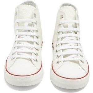 NIB Vetements emoji and logo print high top sneaker. RETAIL $790 Vetements' high-top sneakers are constructed of off-white and white logo-print canvas. Made in Italy, this pair is printed at the quarter panel with an eye-rolling emoji. 0.75/20mm midsole (approximately). Rubber toe cap Emoji patch at side. Rubber logo graphic White flat laces. Silvertone hardware. Lace-up style. Lined with canvas. Rubber sole. Made in Italy. Mens Size 8 M, Womens Size 10 M