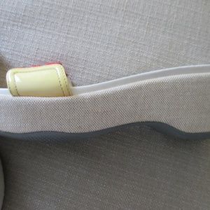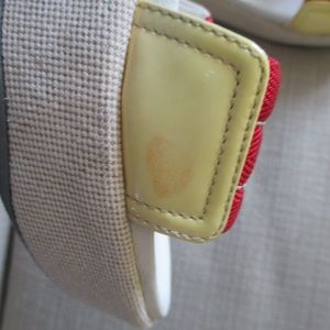 AUTHENTIC PRADA red, yellow sandal with wave canvas covered platform heel...PRADA inscribe on red strap...SIZE: 39.5 US: 9-9.5b...HEEL: 2 1/2"...PLATFORM: 1 1/4"...excellent shape (burlap is clean ad mint)...some marks on yellow patent leather accents on strap (see last 2 photos)..