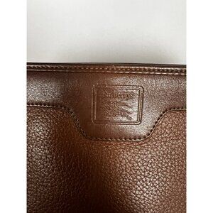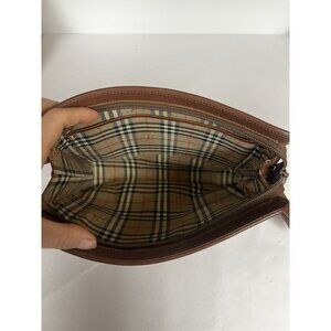 The product is a genuine leather vintage Burberrys wristlet clutch in brown. This medium-sized bag features a solid exterior with a zip closure, brown hardware, and a fabric lining in multicolor. It has a classic designer luxury style suitable for both men and women, with additional pockets for added functionality. The brown leather handle/strap adds a touch of elegance to the timeless and versatile design of this unisex accessory.