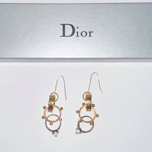 AUTH VTG Christian Dior Gold & Silver Triple Ring Drop Dangle Logo Hook Earrings