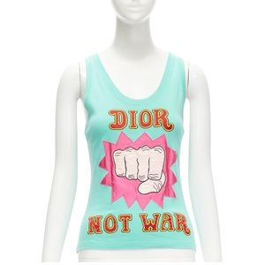 Authentic Vintage 2005 Turquoise Racerback Dior Not War Tank Top with Silk Cartoon Graphic on the Front and Stars on the Back.