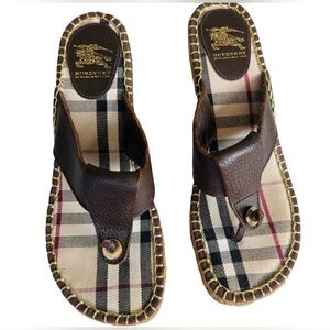 DESIGNER BURBERRY BROWN LEATHER NOVA CHECK WEDGE SLIP ON ESPADRILLE THONG SANDALS