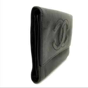 AUTHENTIC CHANEL BLACK CC LOGO GRAINED CALF SKIN TRIFOLD WALLET