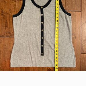 AUTHENTIC CHANEL GREY SLEEVELESS GOLD BUTTON TOP W/NAVY BLUE TRIM SIZE 40 EURO