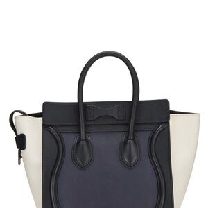 Classic Celine Luggage tote in the medium 'Micro' size, rendered in black, white, and navy drummed calfskin leather and accented with gold-tone hardware.