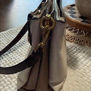 AUTHENTIC VINTAGE COACH CROSSBODY BAG CREAM WHITE AND TAN. 2 ZIP COMPARTMENTS AND ONE MAGNETIC CLASP COMPARTMENT IN THE CENTER. CAN USE A CLEANING BUT IN EXCELLENT PRELOVED CONDITION. 11” across 8” tall