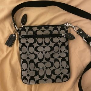 Black, adjustable cross body strap, smaller size, a bit dirty in around the inside trim
