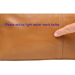 Great pre-loved condition. Does have a water mark on the back as shown in the photos above. From a smoke/pet free home. PLEASE ALWAYS LOOK CLOSELY AT ALL THE PHOTOS BEFORE DECIDING TO MAKE A PURCHASE IN CASE I MISSED SOMETHING. Made of a beautiful soft, buttery leather in tan/butterscotch color. Has the authentic hang tag! Creed is C045-9554. Very nice inside as well. Inside, it has a zippered pocket and 2 slip pockets. Top zipper closure. No pockets on the outside. Measures approx. 15"long x 9"high x 5"deep. Double adjustable leather straps have a drop of approx. 10". This is pre-owned. Silver tone hardware. REASONABLE OFFERS ALWAYS WELCOME.