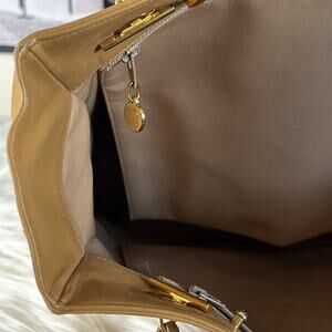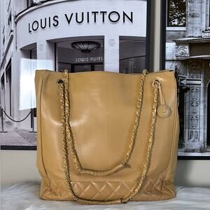 Elegant tan leather tote bag with a quilted design and gold chain straps. Perfect for everyday use.