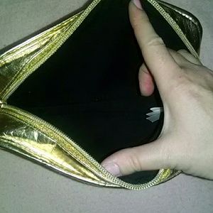 Minnie Mouse Makeup Bag, color of bag is gold. So adorable and top quality product bought from a boutique in Disneyland. Has gold tassle attached to zipper that can be removed. Minnie is applying lipstick in the picture. Nice sized bag for travel, clean and very good condition. 100% AUTHENTIC 100% Minnie Mouse Approved!!!***Betsy Johnson for exposure***