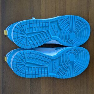 The Nike Dunk High ‘Blue Chill’ takes a heritage high top and treats it to a brilliant blue finish. The upper of smooth leather constrasts with overlays in a vivid pastel blue which repeats on the signature Swoosh, collar and rubber outsole. Adding pops of color to this two-tone palette are the heel table and Nike branding on the woven tongue tag and sockliner in Amarillo yellow.