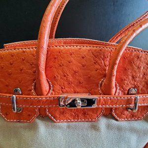 This sale if for an AUTHENTIC EILEEN KRAMER OSTRICH LEATHER & FABRIC Shoulder bag. This handbag is like NEW! There is not a mark on it and does not look like it was ever used. The leather is bright orange Ostrich, and the fabric is a tan (kind of burlap looking) fabric. There are 2 rolled leather handles that measure 8.5" form the top of the bag. The bottom of the bag has 5 feet, and the leather is unmarked. There is a unique lock and key feature (see photos) where you can put the mini pad lock on the front of the turn lock to prevent anyone from "pickpocketing" your bag which would be great for traveling. The hardware is a bright silver tone. there is one zippered pocket on the outside.
