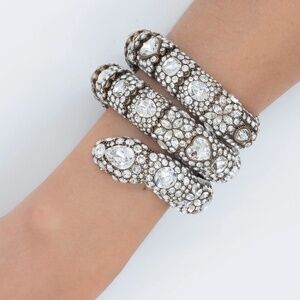 The Gucci Triple Wrap Snake Bracelet is a stylish and luxurious piece of jewelry that exudes elegance and sophistication. Made in Italy with crystals hand set in gold-tone metal, this adjustable bracelet is a versatile accessory that can be worn for various occasions. The white color and sleek design make it a timeless piece that can be worn for years to come. Excellent condition as shown in the photos.