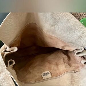 Meet a true Y2K Gucci beauty in that creamy ivory tone that goes with literally everything. This bag is all about that early 2000s Gucci vibe where the leather feels rich, substantial, and made to last. The silhouette is relaxed but still structured, with a gorgeous foldover flap and an embossed GG tab detail that gives it that quiet luxury look up close.
