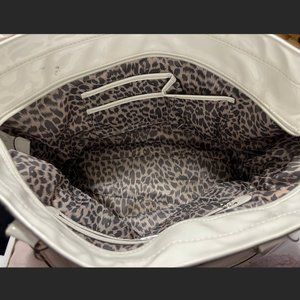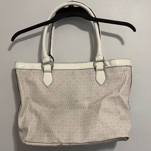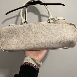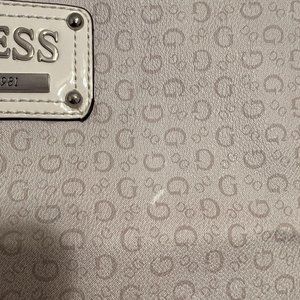 This AUTHENTIC tote bag/purse is beige and from Guess. It was used as a school bag for me and I attached photos of a few tiny marks on it. On the front there is a tiny mark from white out but it is barley noticeable and pretty much blends in, on the top of the bag there are a few scuff marks that could be from a pen/pencil, and lastly on the very bottom there is a small mark but is not noticeable since it is on the very bottom of the bag. The inside of the bag has no markings and is in great condition!