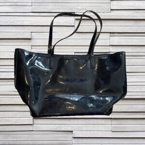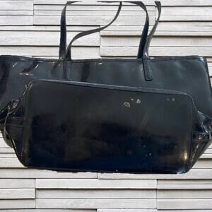 This versatile Kate Spade purse is patent black with the Kate Spade “spade” logo all over the exterior. The interior is tan with two slip pockets and one zippered pocket. The purse was one of my favorites so it was used often. There are scuff marks and blemishes. The handles have some wear (see pic). Kate Spade label on front. It measures about 17” x 10” tapered to 14”. Much life left in it. Grab a designer purse for cheap and touch it up. From a smoke free home.