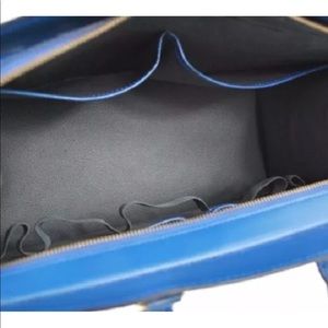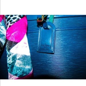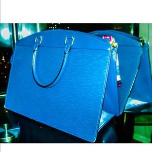 RARE VINTAGE Blue epi leather Louis Vuitton Riviera bag with gold-tone hardware, interior pockets, top zip closure and rolled handles.