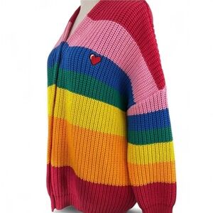Lazy Oaf oversized cardigan with bold rainbow stripes, “BORING” lettering on the back, and small embroidered heart on the front. OS, fits best oversized on M-XL. In very good used condition, no noticeable flaws.