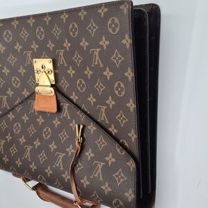 Sophisticated Louis Vuitton briefcase with iconic monogram pattern. Perfect for professionals seeking style and functionality. This briefcase is in amazing condition. You will love it. The brass is in immaculate condition as you can see. Freshly cleaned and polished by us so you don't need to do it. The interior and exterior has been freshly cleaned and condition again by us. The slip pocket in inside and outside has some colour loss as shown in the photos. But apart from that everything looks excellent. There is no odor, no wear on the edges, no cracks or chips in the canvas or no marks that I can see. There is some creasing on one end of the handle. Please see photo. This briefcase expands to fits your files easily without destroying them. There is also a pen slot. The pen slots feels a sticky on the outside. 2 keys included.