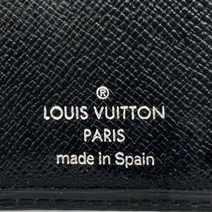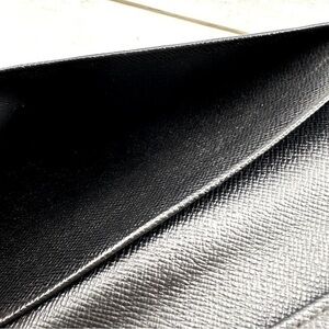 Simple long wallet containing two slip-in pockets on one side, six card slots and one spacious slip-in pocket which could easily hold a checkbook or pocket planner on the other. Previously owned: wear should be expected and reinforces the history of this heritage piece. Faded or worn areas may have been repaired with Louis Vuitton color matched materials. Please see last photo for specific of torn area near pocket. Overall this item is very usable and in good condition. Color: Black