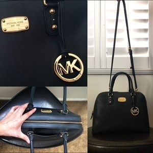 ***MY PRICE, $250 (FIRM)*** Michael Kors Saffiano Large Black Satchel, Somewhat New, No tag, Used twice, Hardwares (interior & exterior) are fully intact & in great shape, No stains of any kind, Rectangular plated logo has minor marks, but overall, in great condition, Has gold metal studs at the base to protect the bottom, Comes with a cross body strap. Has enough structure but it's conclusively not flat or flimsy at all. High quality & definite durability.