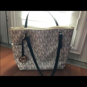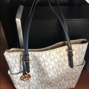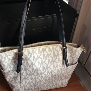 AUTHENTIC Micheal Kors medium size tote purse. In like new condition and barely used. It is Navy blue and white with signature MK letters.