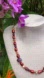 In between the pearls are amber colored crystals and purple faceted stones color of amethyst.