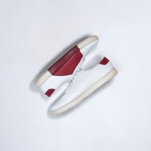 A refined pair of Prada sneakers featuring a chic white and burgundy colorway, perfect for any fashion enthusiast seeking a blend of elegance and comfort. These sneakers have undergone professional color restoration, ensuring a fresh and vibrant look.